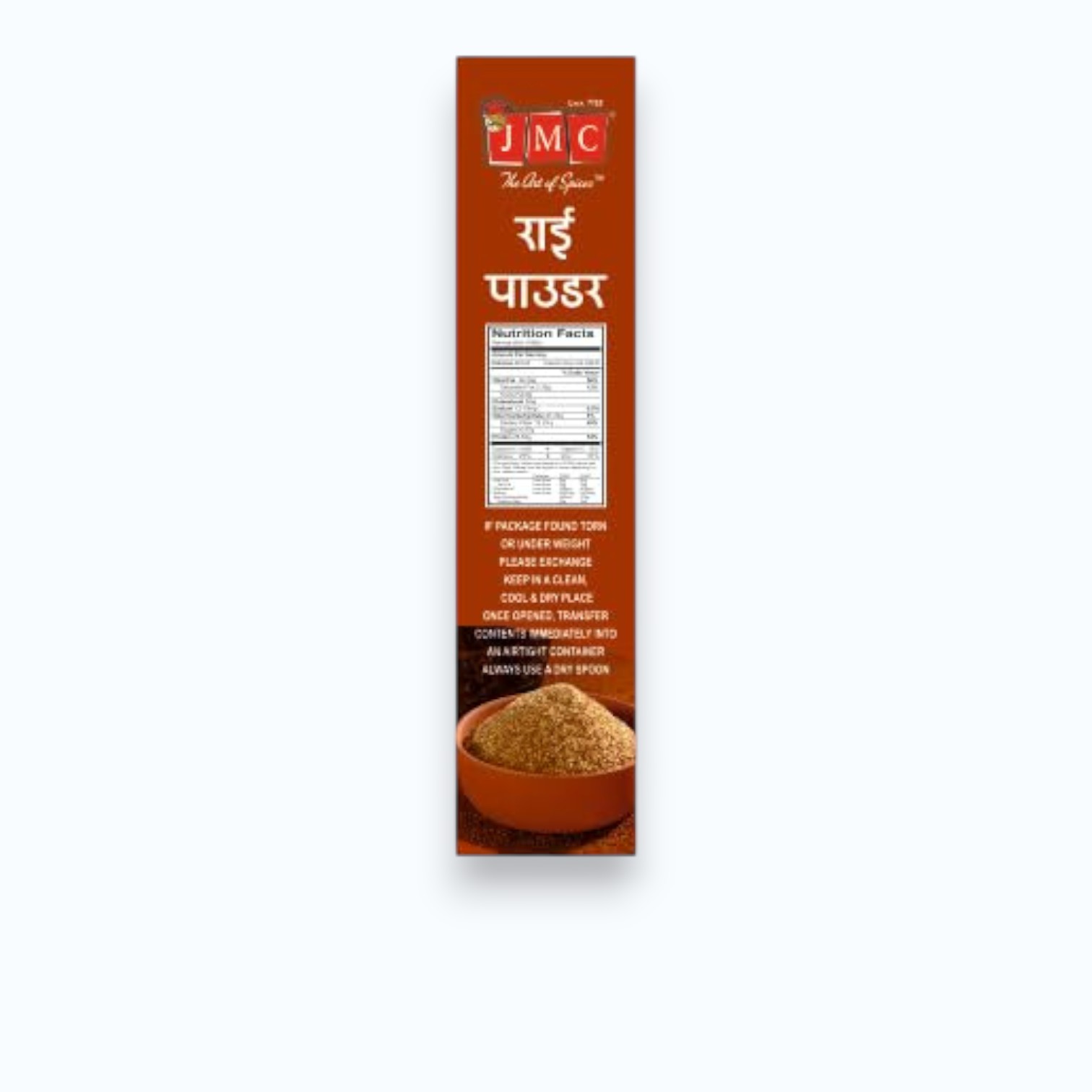 JMC Rai (Mustard) Powder is made from carefully selected mustard seeds, finely ground to retain their natural pungency and flavour. Pure, unpolished, and hygienically processed, it is suitable for everyday cooking and traditional recipes. An export-quality product trusted for over 35 years.
