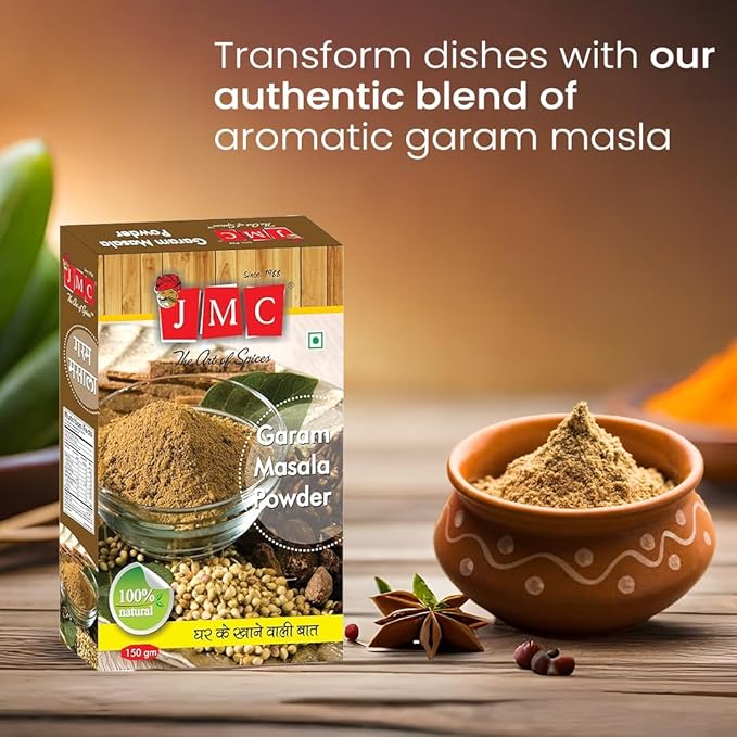 JMC Premium Special Garam Masala Powder is a rich blend of the most flavorful spices, carefully crafted without dhania to deliver a powerful aroma and authentic taste. Highly pure and concentrated, use up to 30% less than regular brands. A premium-quality spice blend trusted for over 35 years.