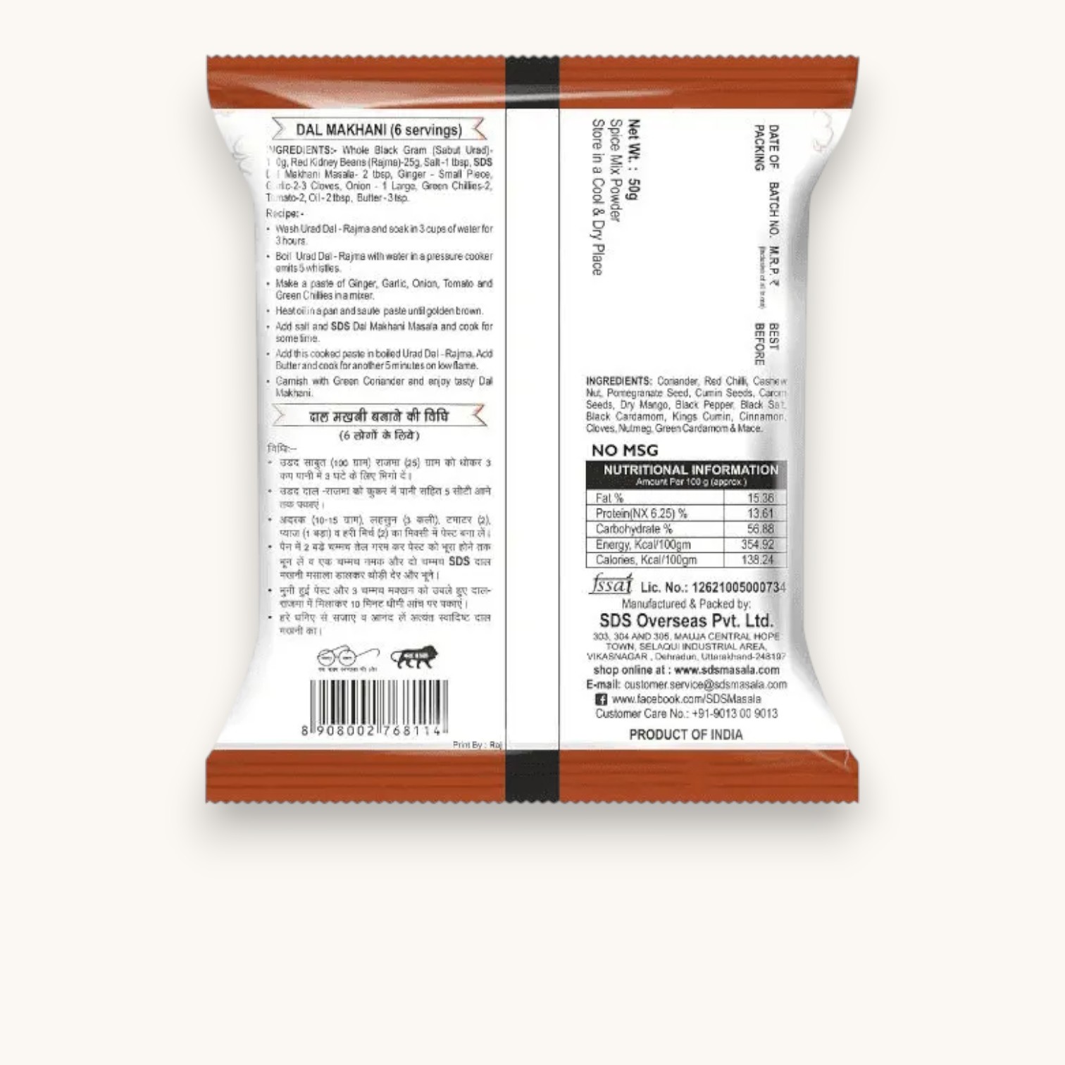 SDS Formulation SDS Dal Makhani Masala is a pre-mixed blend of handpicked spices. It is designed to provide the specific savory profile required for slow-cooked lentils. The mix includes coriander, cumin, and dry ginger, along with darker spices like cassia and cloves that contribute to the dish's characteristic aroma. This powder is intended to simplify the cooking process by providing a consistent ratio of ingredients in every batch.