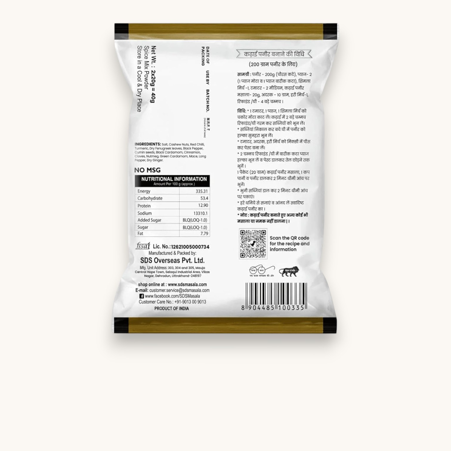 SDS Formulation SDS Kadhai Paneer Masala is a curated blend of handpicked spices. It centers on a strong base of coriander and black pepper, which are the hallmarks of the "Kadhai" style. The formulation also includes cumin, fenugreek leaves (Kasuri Methi), and warming spices like cinnamon and cloves. This masala is ground to ensure that the spices coat the paneer cubes and vegetables evenly, providing a consistent, restaurant-style flavor that is deep and aromatic.